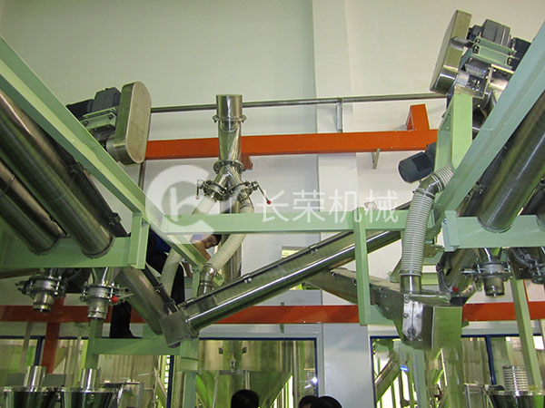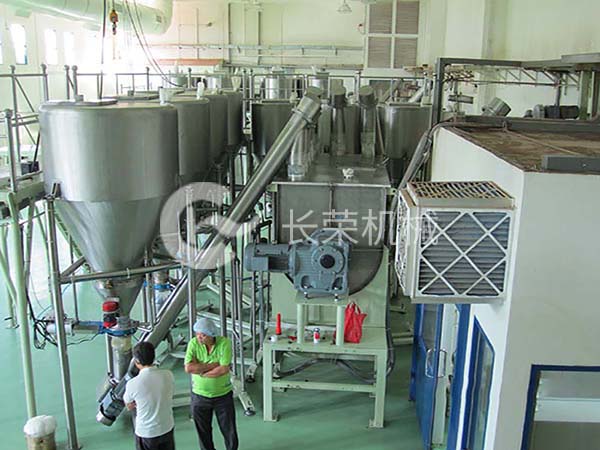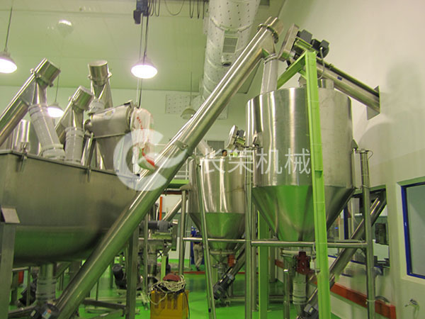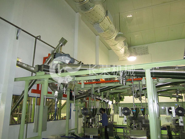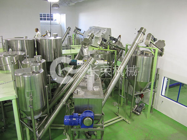 圖一:用于三合一咖啡的包裝和混料車間。由傾斜螺旋輸送機(jī)輸送咖啡粉、白糖、奶精等到儲(chǔ)存料倉或者混料機(jī),再經(jīng)由螺旋輸送機(jī)將混合好的物料送到包裝機(jī)里進(jìn)行包裝。